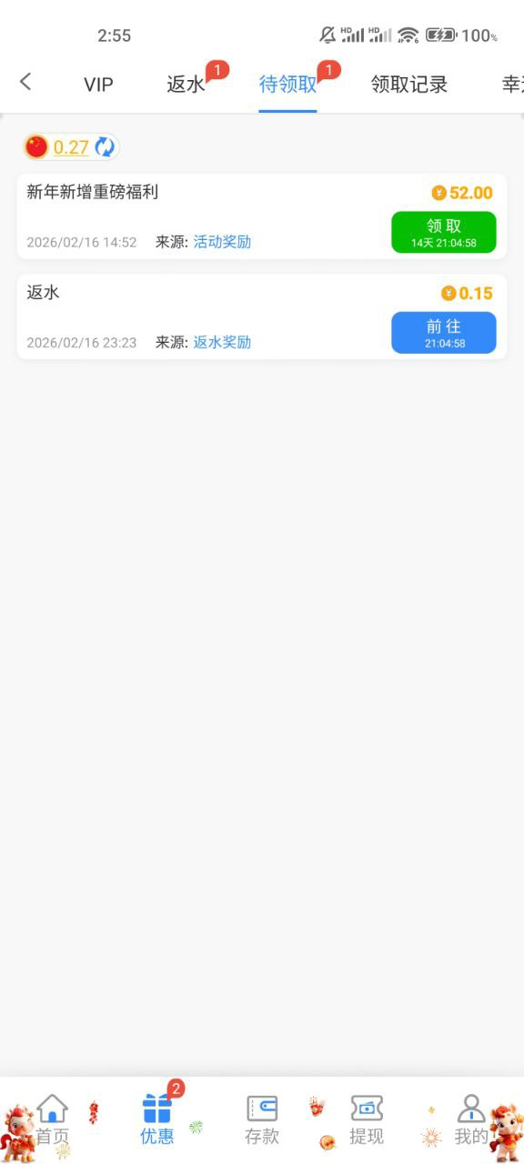 试试常用账号登陆查看,有52跟26彩金,52可以直接提现,26需要10倍流水!