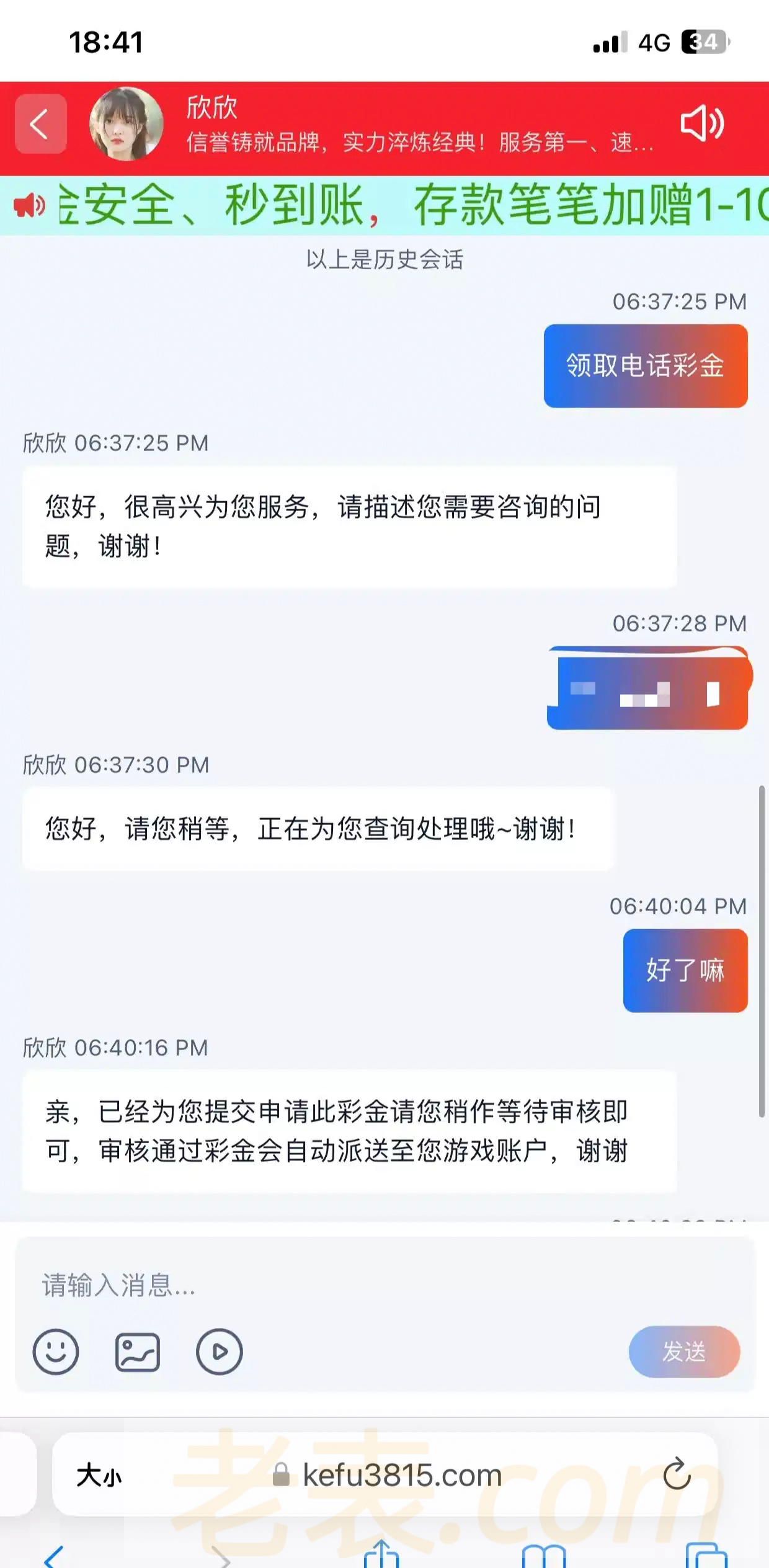 找在线客服碰瓷领取电话彩金,之前论坛注册送38.15的应该都有号链接3815yy.com