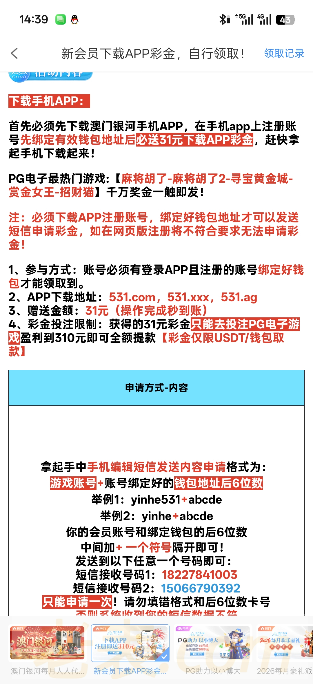 注册绑定下载APP,优惠里按格式发短信秒31,满310提现,出款自测!